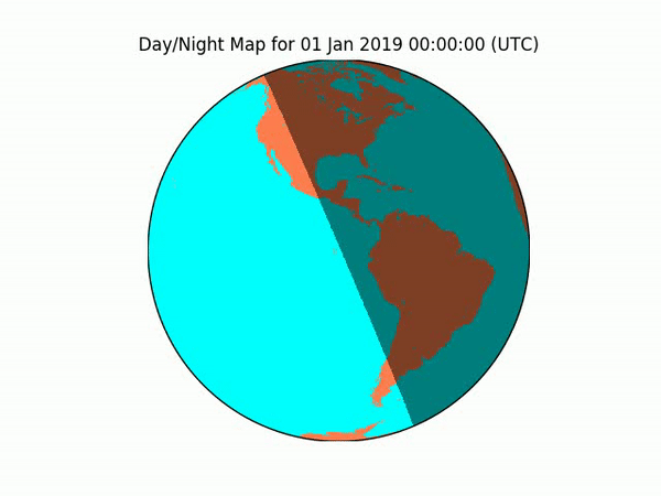 video.release()Here’s what it looks like when I project the independently verifiable, real-world sunrise/sunset calculations onto a globe model. Each frame represents the sunlight on Earth at 7PM CT, as the animation loops through every 5th day of 2019. As you can see, there’s no obvious warping, hinting that the real-world data isn’t being projected onto a model having a different number of dimensions (2D v. 3D, i.e. real-world globe to globe model).