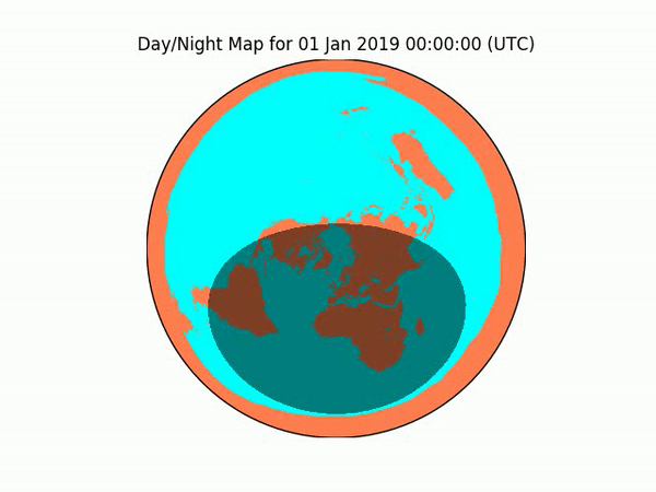 We can use a script to project the verified, real-world sunrise/sunset calculations onto a Flat Earth model, and then onto a Globe Earth model. Below is the source code of the script I used, but feel free to write your own! It loops through 73 days (every 5th day, for a year), calculates the nightshade at 7PM CT (0AM UTC), and draws a shaded area to show the area under night.