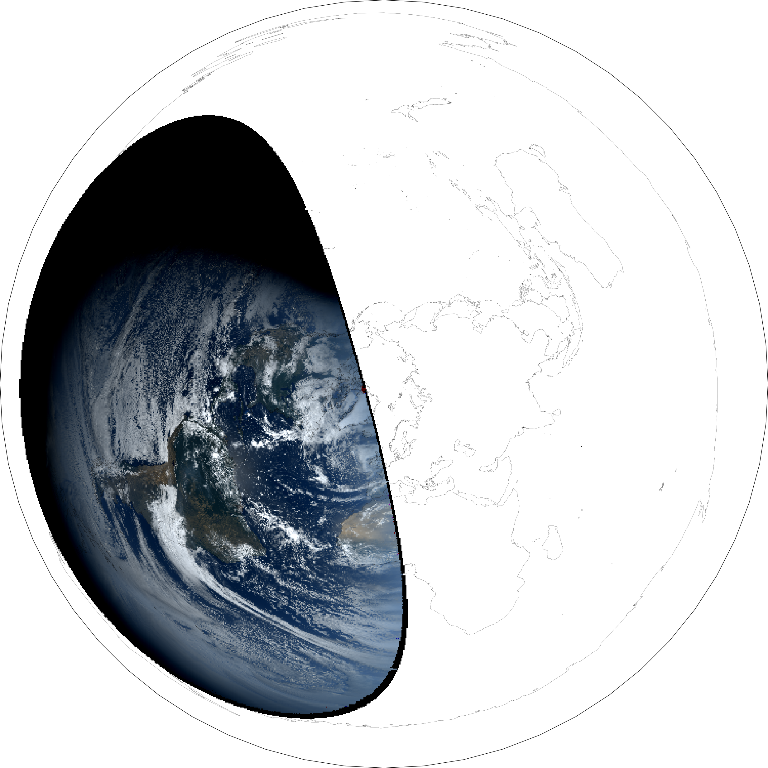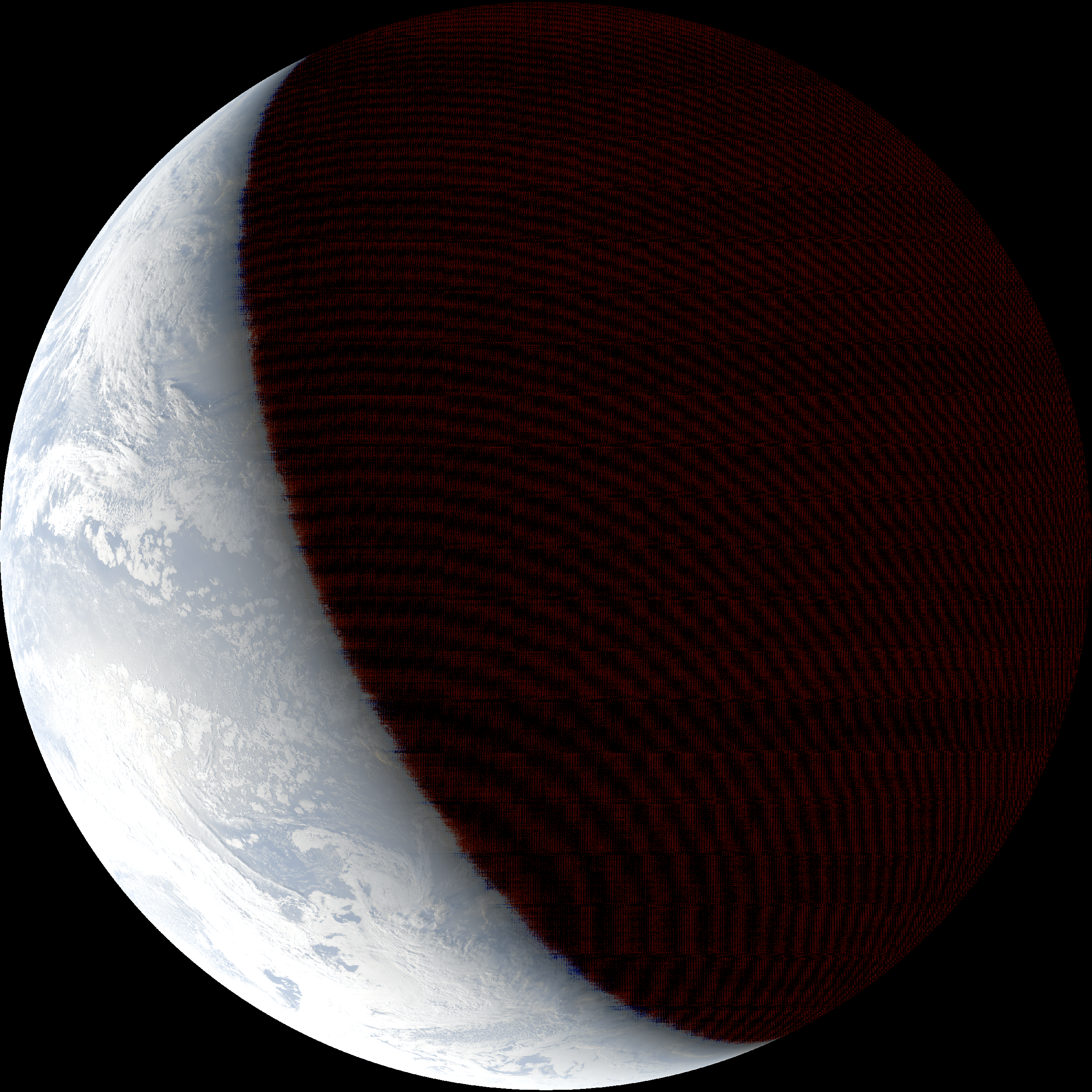 I found a way to collect and process raw data from the publicly accessible point in the Western sky called GOES-16’s “geostationary orbit” (or did NASA install sensors in the firmament 0_o??) When I select from its sensors, combine data from them, and map them onto a globe model and a flat model, I can compare it with those real-world sunrise/sunset calculations we worked with earlier, and get almost the exact same thing: